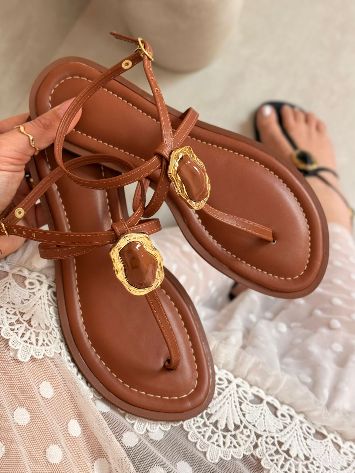 Sandália Rasteira Pedraria – Caramelo